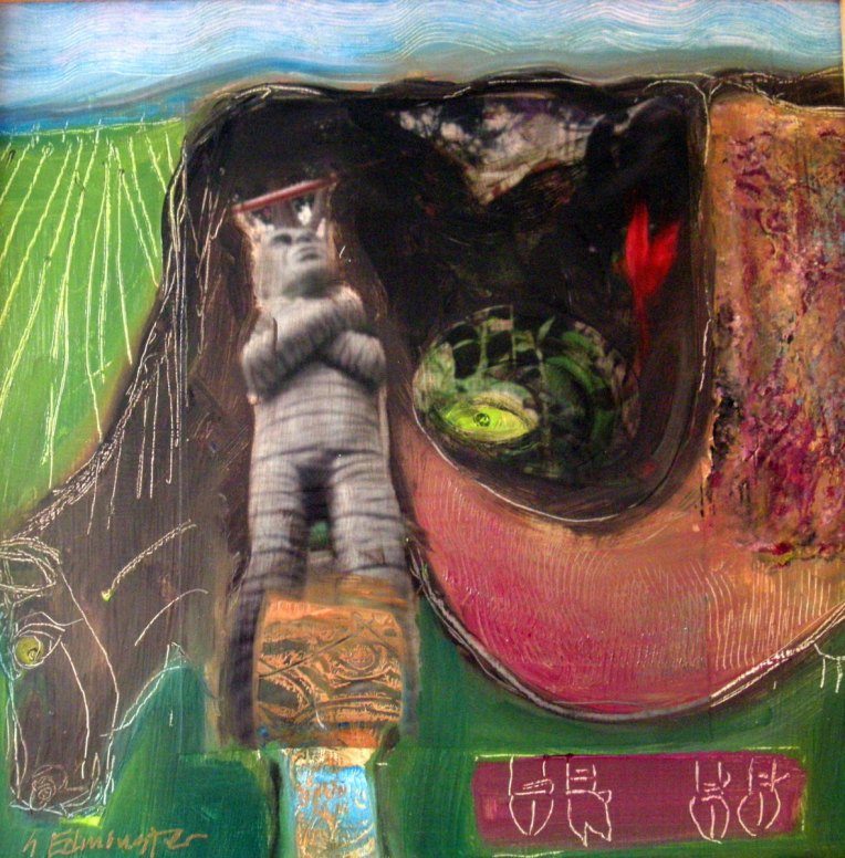 Some years ago  I mounted blown-up, cut-out photocopied images of my own pinhole photos on Masonite. I had a photo series of a small, two-inch Mummy, an Invisible Man model,  a Barbie doll, and a plastic toy lizard.  Keep an eye out for them, as they pop up in various combinations in all four paintings.