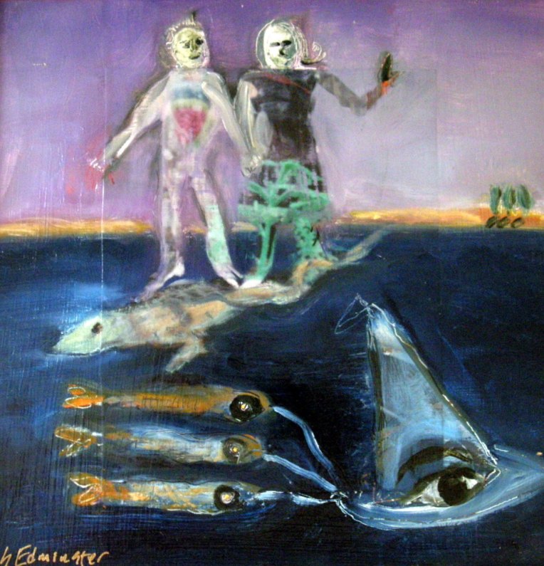 Oil paint stays open, or wet, for quite a while.  Using a soft rag, I would rub parts back to the original photo, then add more paint, and repeat this, over and over, until new images started to form.  It was like watching a mysterious image develop.  I had no plan for the original mounts.  The images just appeared.  The first one was Eye Boat, below.  You can see the guts of the Invisible Man, and the lizard became a sort of surfboard.  They are led by the Eye Boat–led by the eye, or vision–which tows three fish.  Maybe they’re the next three paintings.