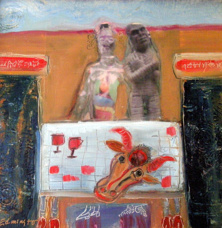 The Sacrifice is the darkest of the series.  The couple becomes androgynous, with the partner becoming a sort of butler or servant.  A table appeared in a desert.  Hooves and feet were scratched into cartouche forms. A smiling cow head appears on a table with two glasses of red wine. This has a forsaken feeling; I thought of Shelley’s poem Ozymandias. Motifs kept repeating: the high horizon, the pillars, the animal forms.  I was dreaming in paint.