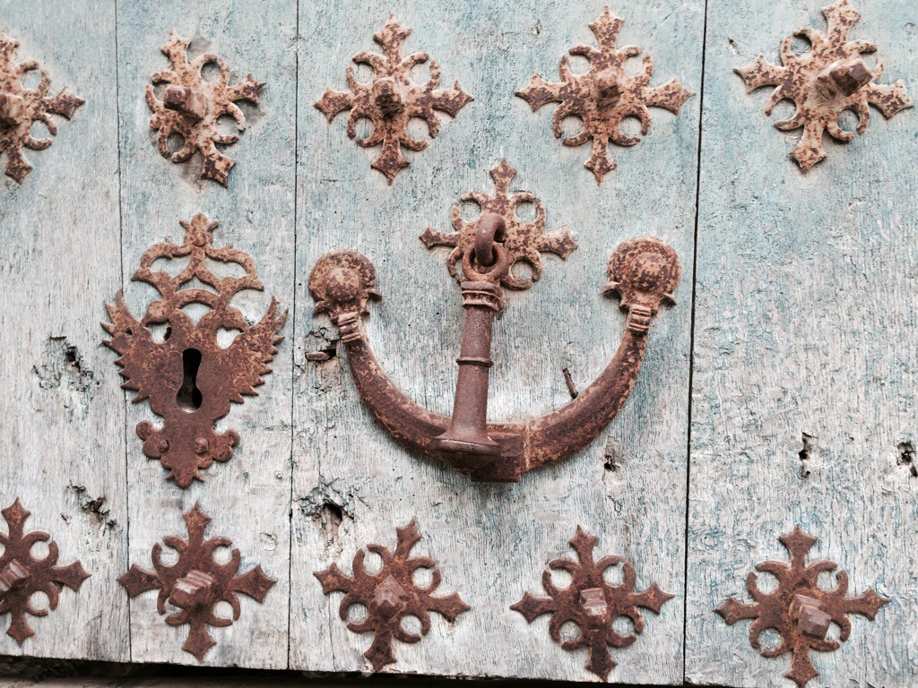 Love the anchor on the door, seeing the menu at the cafe, a medieval flair of the arches — as well as the choice of many directions for the path with the background of the blue beauty of sky and clouds.