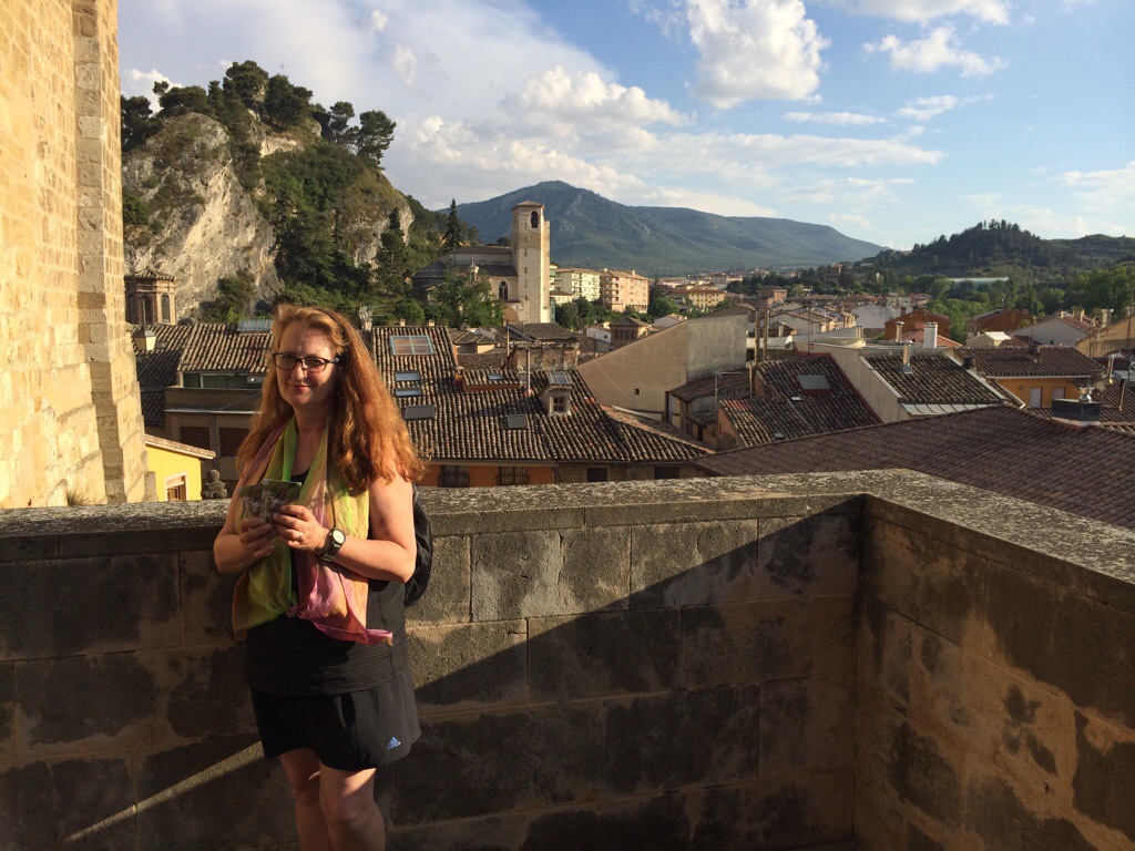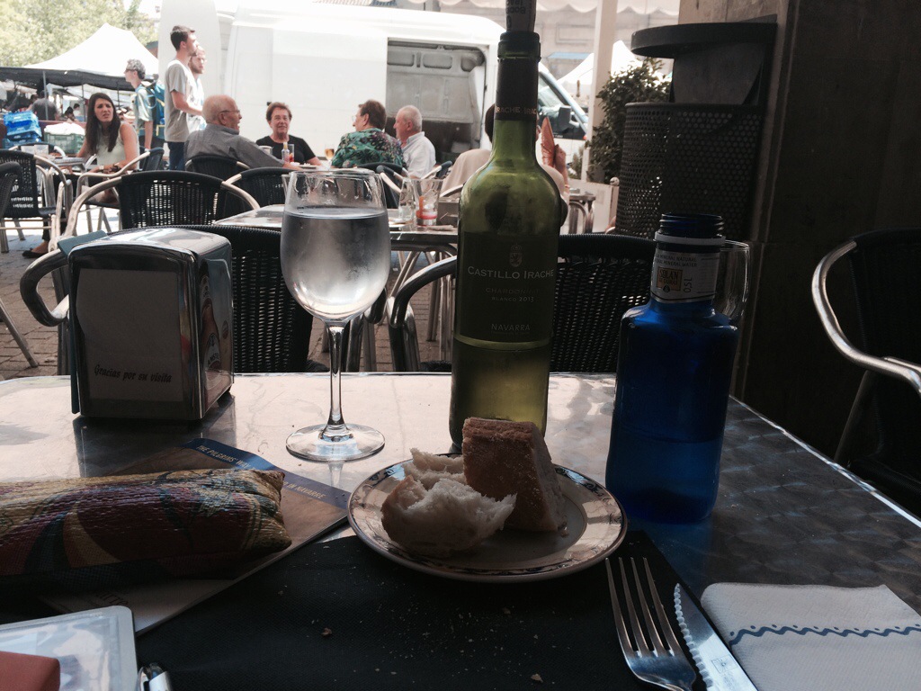 Estella is a good time town. If I could, I would have you all to the meal I had over an extended two hour lunch in the square. Even the town’s motto is about eating: midieval foodies! A quarter bottle white wine (Navarra chardonnnay), water, the appetizer, melon with Serrano ham,