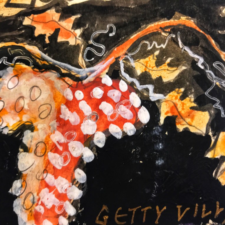 I made these drawings in the Getty Villa’s Underworld: Imagining the Afterlife exhibit. One thing that tickled me the most was Plato’s disdain for those who only wanted to go to the Underworld to drink wine.  There apparently was a cult devoted just to that.  As a citizen of perhaps one of the most hedonistic places on the planet, Sonoma County, California, where wine, weed, and fine food are elevated to a religion, I understand.