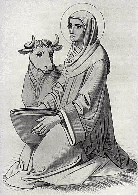 Brigid is a jolly saint of babies, poets, cows, scholars, travelers, and beer (the last attribution mine). She’s a vernal saint associated with the green fire of rising spring energy. Her Day is February 2, Imbolc. In Celtic mythology this the beginning of pre-spring, lambing, and lactation… birth and milk in the animal folk. She is a patron Saint of milk and milk givers, beast and human.