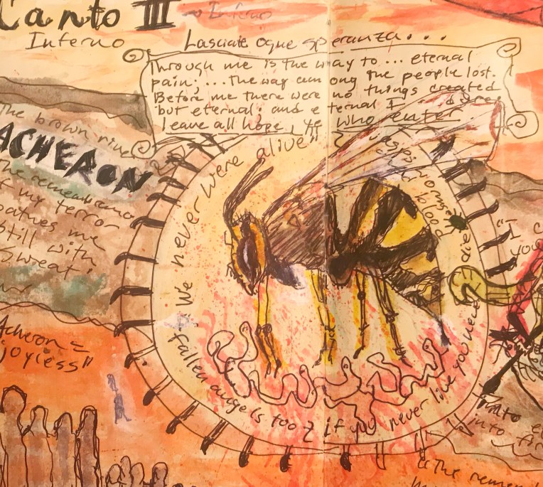 Plagues were a fact of life in the 13th and 14th century. But Dante saw the worst infection as a moral plague infesting his time, with politics destroying peaceful structure and ripping Florence apart. This next sketch features a wasp from his description of demons flying up like swarms of hornets.