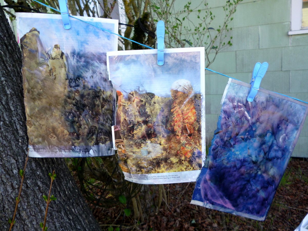 What can you do when an art piece is wonderful and you had no part in it? There is nothing to do with this page of the National Geographic, altered by Citra Solv splashed on it and left to dry on a line, other than to toss it into a pile of other paintings as relentlessly beautiful as a pile of autumn leaves.