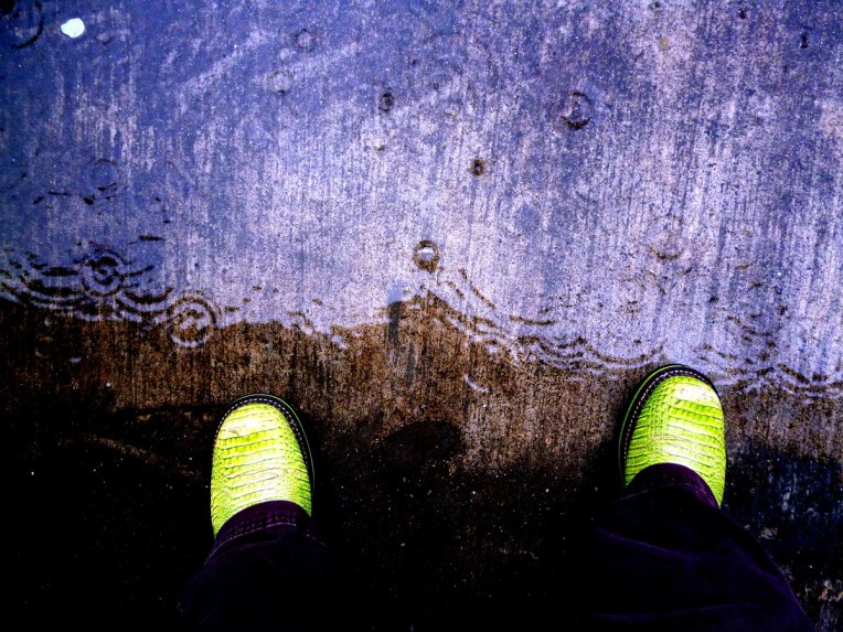 My boots and rain hitting the pavement, spring 2012.